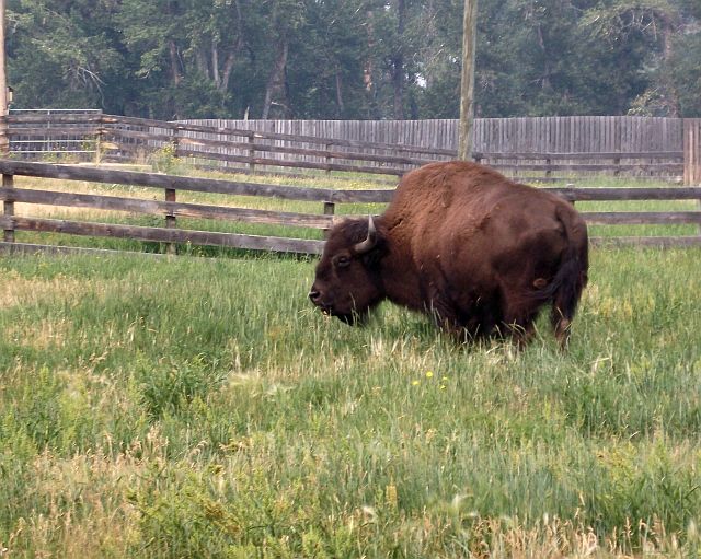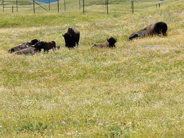 Einige Kilometer weiter machten wir einen Schwenk, um Bisons zu beobachten. Wir trafen zwar eine Bisonherde, aber sie waren rund 200m weit weg und kümmerten sich überhaupt nicht um uns, die wir ja extra aus Deutschland gekommen waren, um sie zu sehen! Hier kann man sie in demselben Gebiet eimal näher sehen.