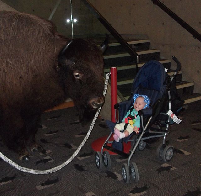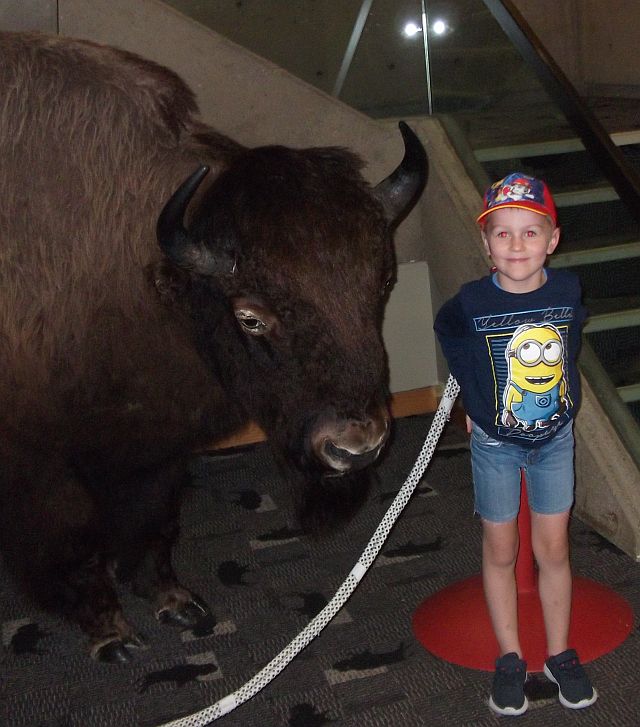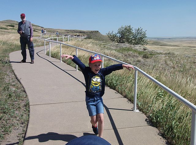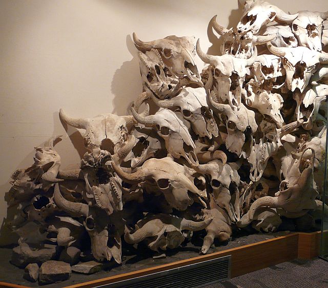 Das wurde ein ereignisreicher Tag. Zunächst fuhren wir zu einem Museum der besonderen Art, dem "Head-Smashed-In Buffalo Jump". Dank der 150-Jahr-Feier Kanadas hatten wir freien Eintritt zu diesem UNESCO-Welterbe.  Hier die Route. Es ist an einer Stelle errichtet, wo die Indianer früher Bisons über eine Klippe trieben, wobei sich die Tiere zu Tode stürzten. Entwickelt hatten sie das vor rund 6000 Jahren. Dazu mussten sich die Stämme zusammen tun, denn nur mit präziser Organisation war der Erfolg sicher.