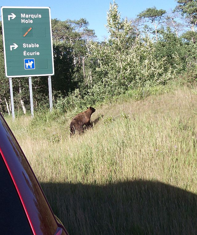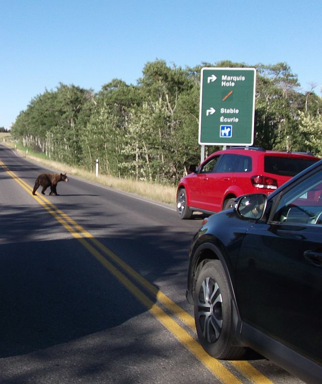 Als wir dann den Park verlassen wollten, überquerte ein frecher kleiner Bär in aller Seelenruhe die Straße, nur wenige Meter von unserem roten Auto entfernt, das wir verbotener Weise verlassen hatten - keine gute Idee!!