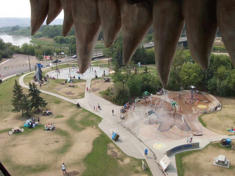 Auf der Rückreise fuhren wir noch bei der Tourist-Information von Drumheller vorbei. Dort steht eine riesengroße Dinosaurierfigur. Sie ist so gigantisch, dass man durch einen Fuß hinauf klettern und aus dem Maul heraus schauen kann. Hier kann man sich bei StreetView rund um die Figur bewegen.