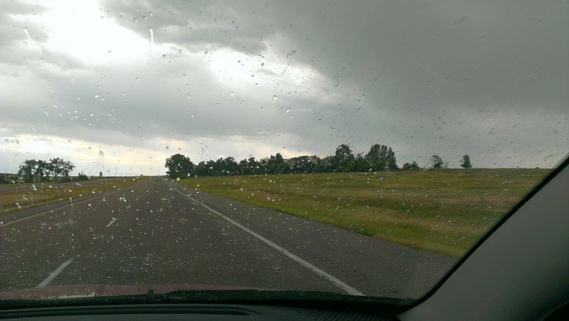 Und obschon in Saskatchewan eine große Dürre herrschte, fuhren wir wiederholt durch Regen und wir sahen richtig schöne wassergeschwängerte Riesen-Wolkenformationen am Horizont (leider regnete es aber an den falschen Orten...).