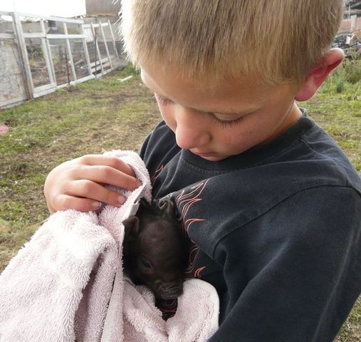Florian mit dem neugeborenen Schweinchen.