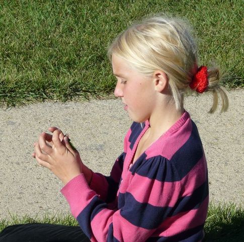 Fiona übt das Flöten auf dem Grashalm.