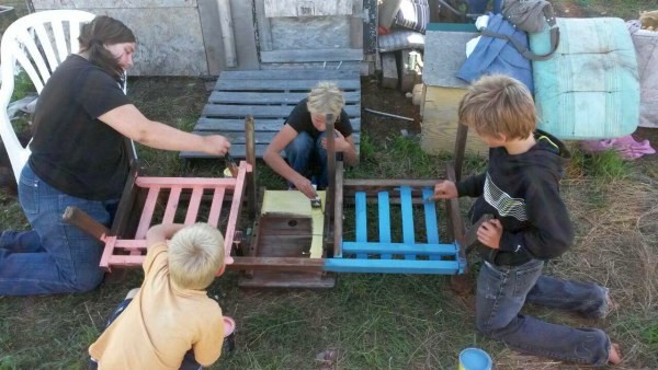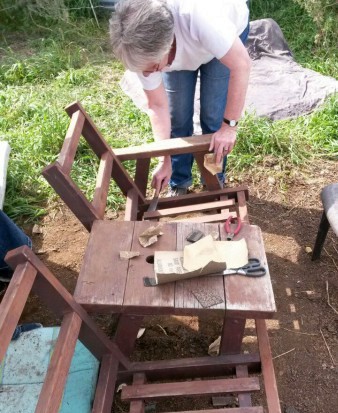 Anfangs haben die Kinder auch noch fleißig mitgeholfen, dann haben sie Judith und Birgit vertrauensvoll die Restarbeit überlassen. Florian hatte aber eine geniale Idee. Er nahm ein Stück Dachpappenziegel, das ja gut mit feinen Steinchen bestückt ist, und schmirgelte damit deutlich schneller die obere Farbschicht ab.