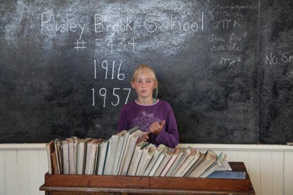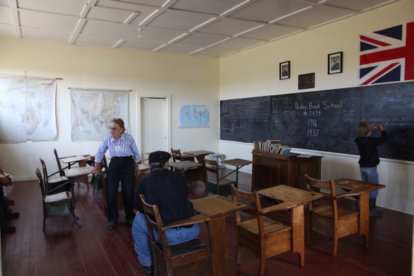 Das weiße Haus ist die alte Schule dieser Gegend. Sie liegt ganz einsam zwischen den Farmen. Das Gebäude wurde auch als Gemeindesaal genutzt. Manche Kinder sind per Pferd zum Unterricht gekommen; es gab dafür extra einen Stall. Die Schule wurde wegen der großen Abwanderung geschlossen: