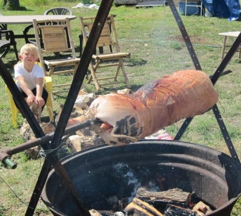 Alle Sitzgelegenheiten waren vorbereitet, das Beilagenbuffet aufgebaut und das Ferkel auf dem Grill zeigte schon eine appetitliche Farbe und duftete wunderbar.